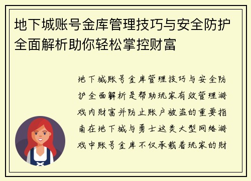 地下城账号金库管理技巧与安全防护全面解析助你轻松掌控财富